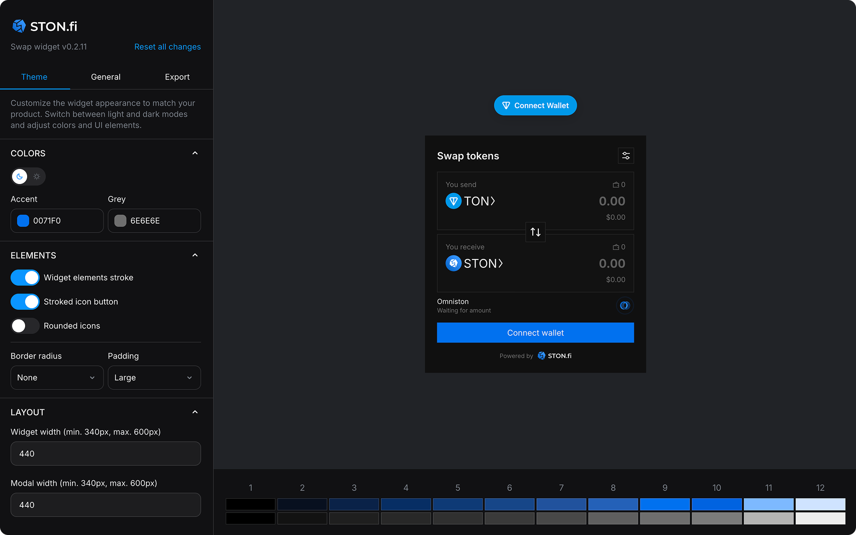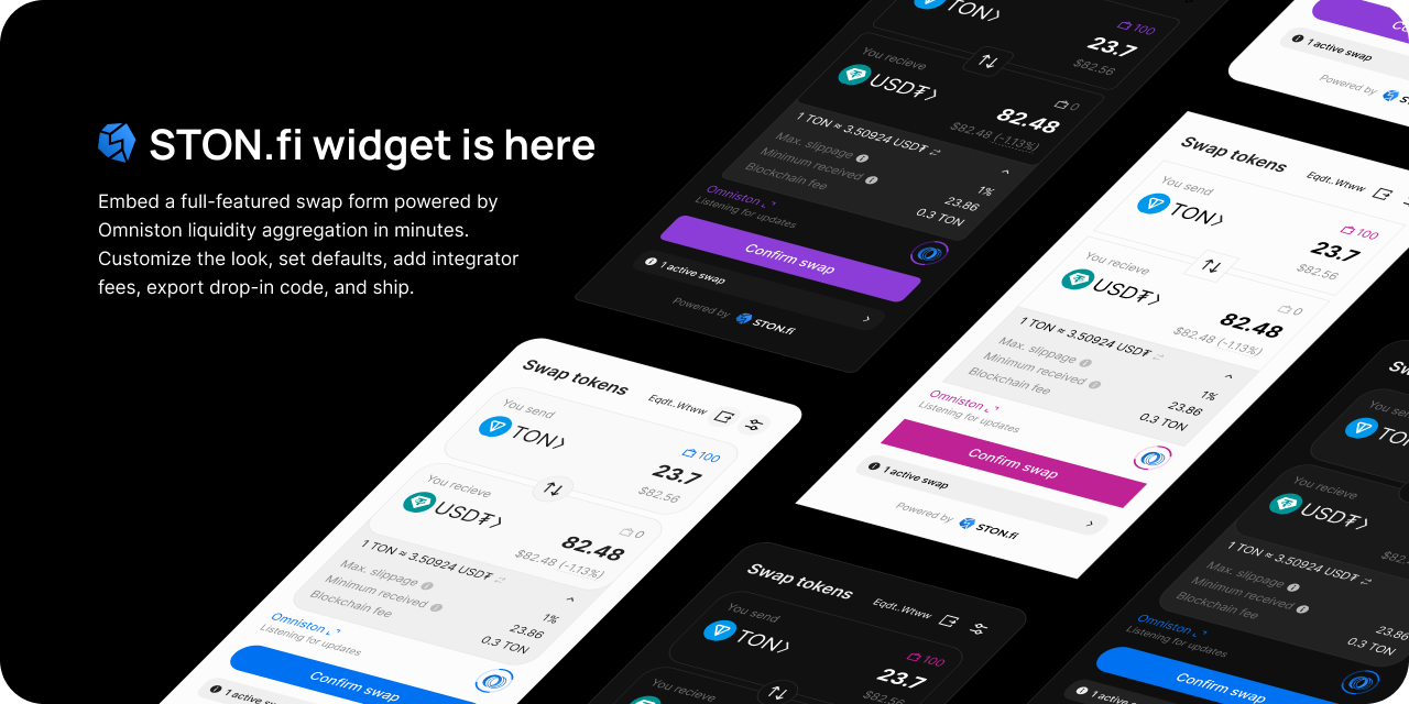 The STON.fi widget is a ready-to-use swap interface for your app or website. Simply embed our lightweight script, and your users get full swap functionality instantly — while you earn fees from every swap.